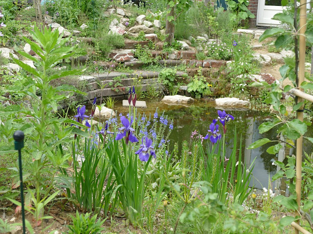 De nieuwe vijver was nog in ontwikkeling en wachtte op wat meer waterplanten. De Groene kikker liet zich er al horen.
